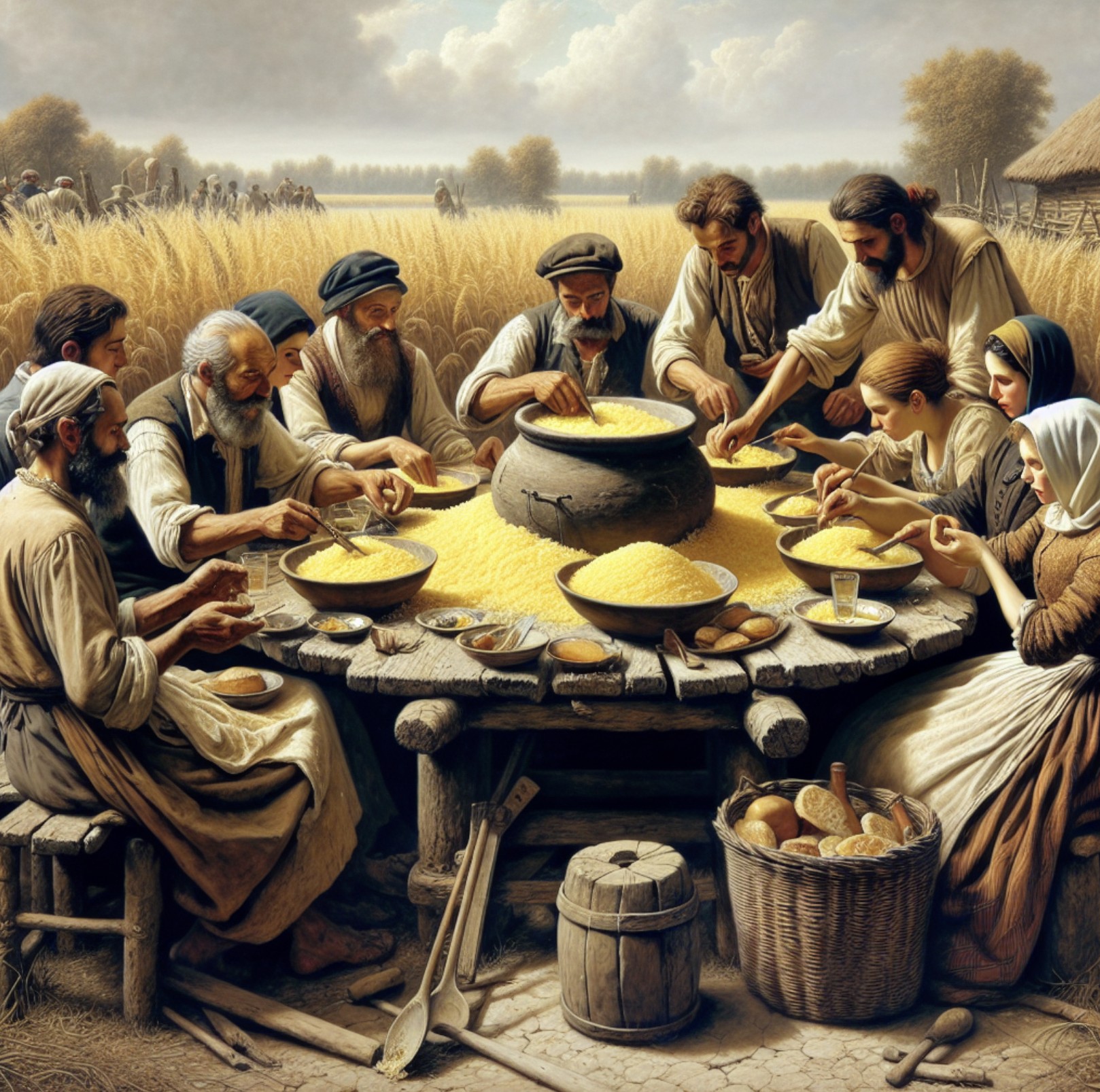 Contadini veneti che mangiano polenta in cerchio - Immagine generata con l'IA.