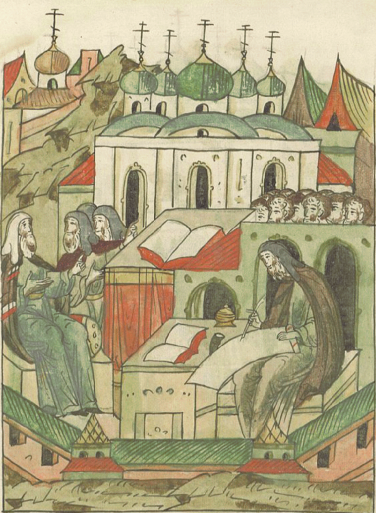 Iosif Volockij scrive un’opera contro gli eretici giudaizzanti, Cronaca illustrata di Ivan il Terribile, 1568 – Wikimedia Commons