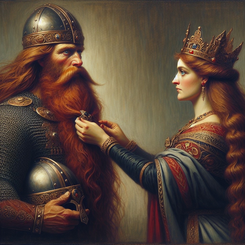 King Harald vows to Princess Gyda not to cut his beard and hair until he is king of Norway - AI-generated image