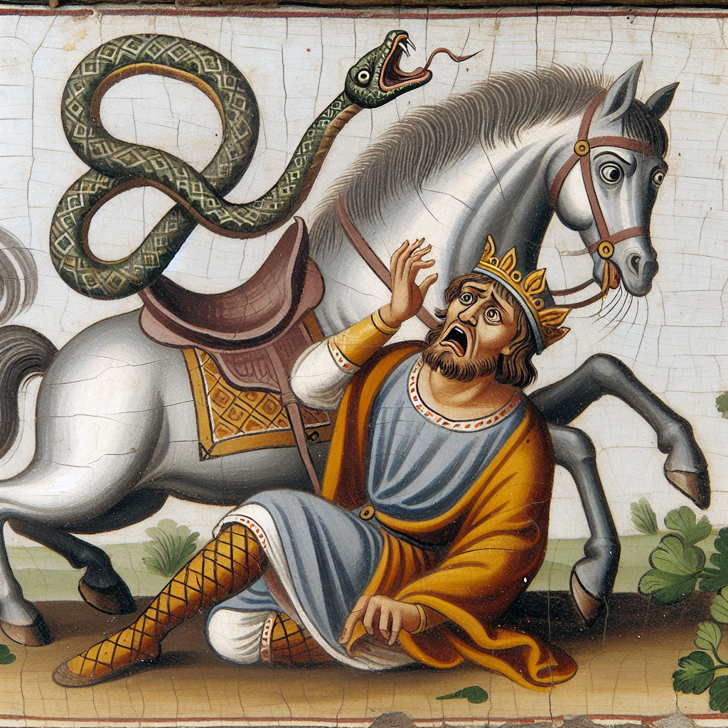 In the "Chronicle of Novgorod" and the ballad "The Song of Wise Oleg", which both refer to him as a prophet (a Scandinavian term also used for a priest), it is said that Oleg was foretold he would die because of his horse. To avoid this fate, the Varangian prince immediately ordered the animal to be sent away. Years later, upon learning of the horse’s death, Oleg, believing the danger had passed, decided to see the animal's remains. As he bent down to touch the horse’s skull in a final gesture of affection, a snake emerged from it and bit him, leading to his death shortly after in 912, thus fulfilling the prophecy.