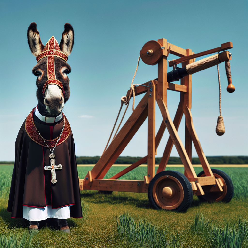 A donkey in liturgical vestments with a (fanciful) catapult next to it - AI generated image