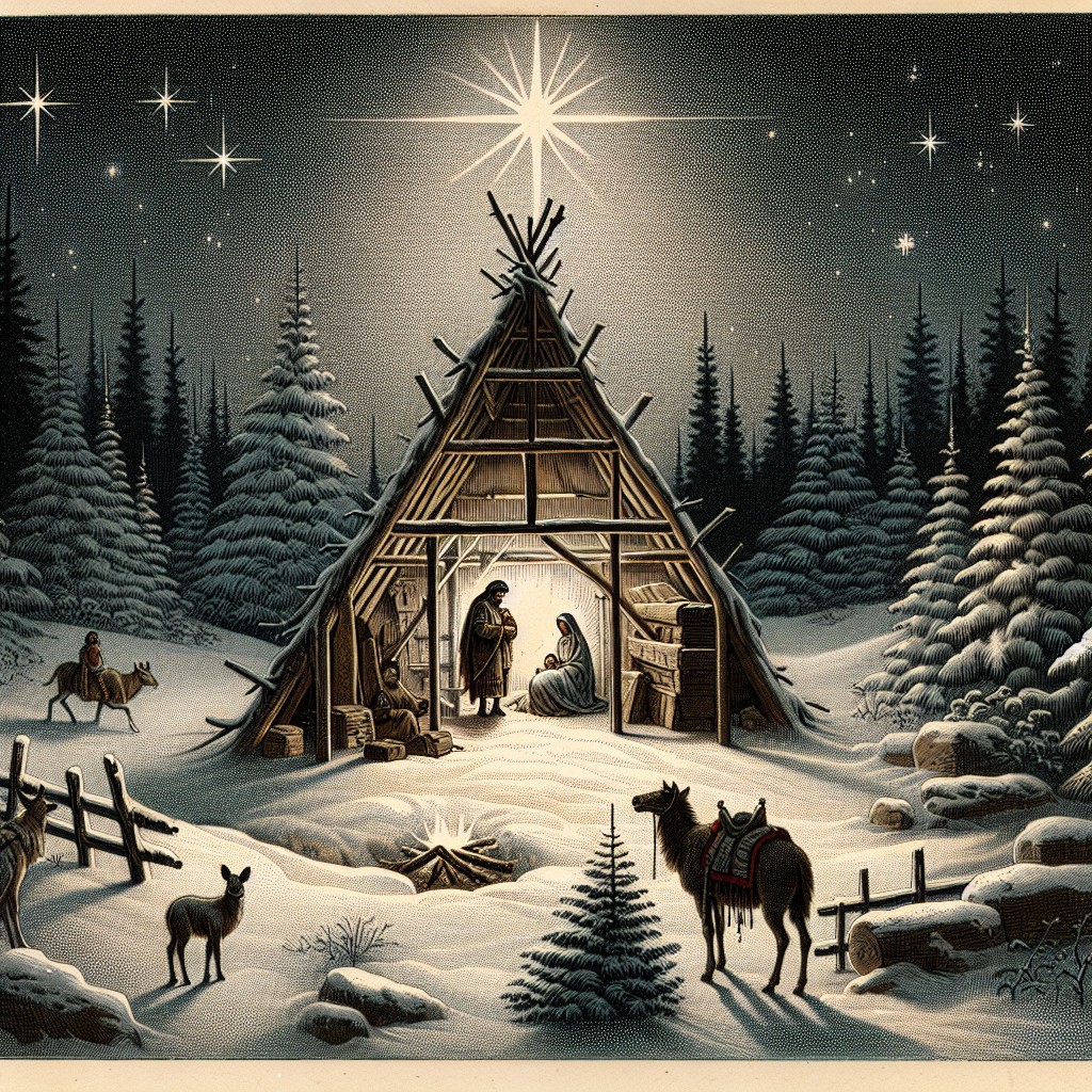 Artificial intelligence-generated image depicting the birth of Jesus in a bark hut immersed in the suggestive Canadian nature.