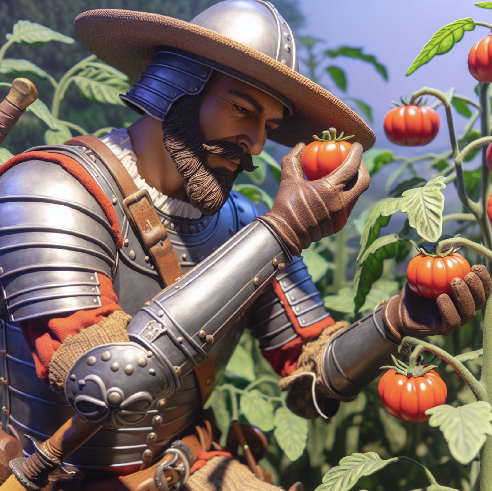 A Spanish conquistador picks tomatoes (albeit red ones) in Mesoamerica - Image generated with AI.