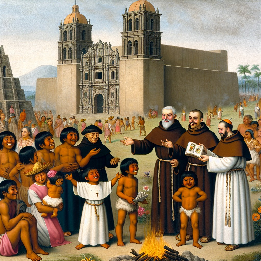 Indigenous children and youth from Mexico enjoying setting fire to pre-Christian cult symbols alongside Spanish Franciscan friars. - Image generated with artificial intelligence.