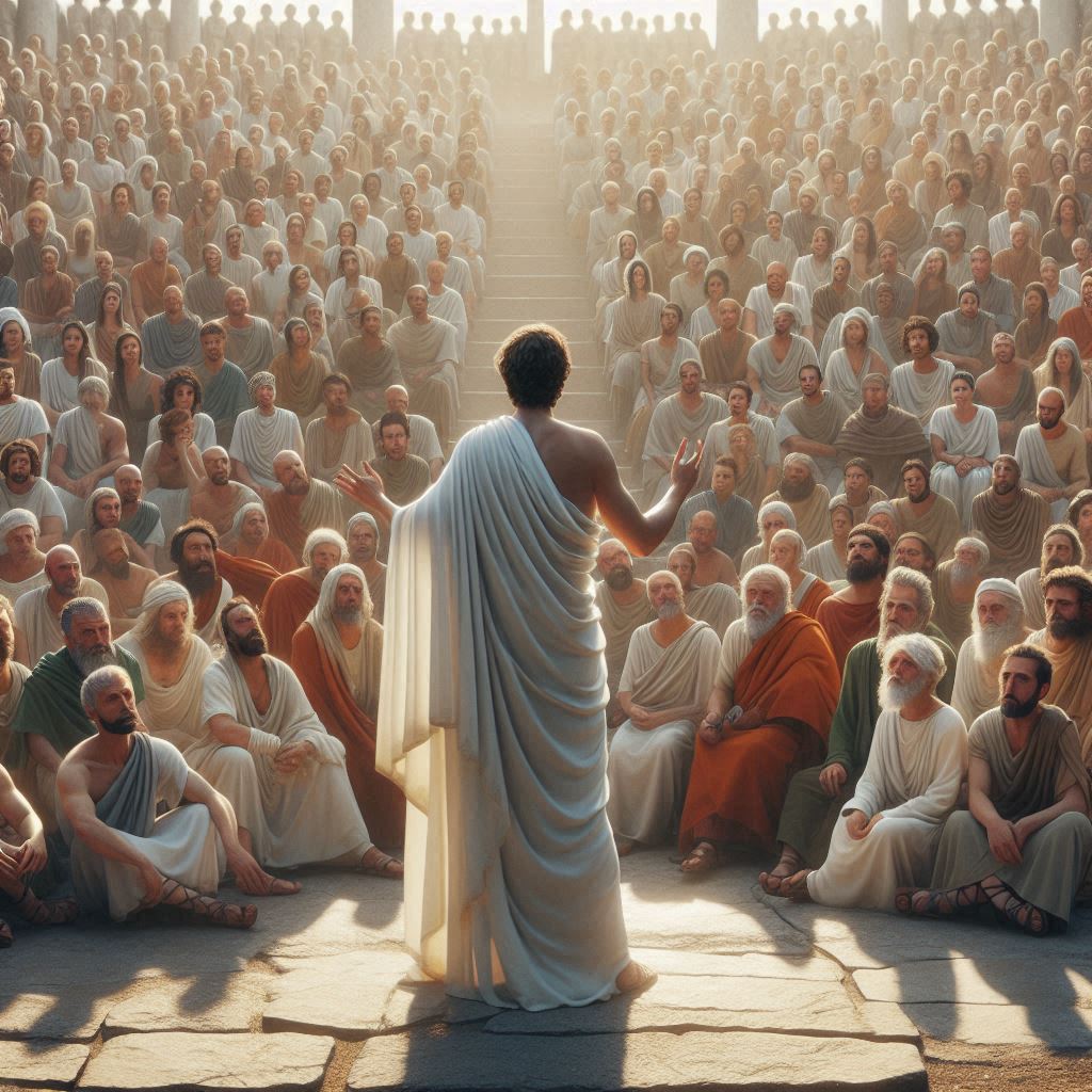 Demosthenes delivering his anti-Macedonian orations to the Athenian crowd - AI-generated image